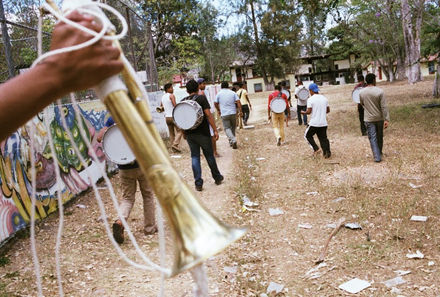 Prospective students must pass both the academic entrance exam and the socio-economic requirements. Once accepted, staying in the school is not a simple matter. Tuition and board are free; the state government provides a meal budget that only amounts to a few dollars per student per day, which usually means a diet of eggs, rice, and beans. The school does not have a travel budget or a sufficient transportation system for students. For decades the students have practiced a controversial method of securing transportation: they stop commercial passenger buses and inform the driver and all on board that the bus would be commandeered for “the educational purposes of the Escuela Normal Rural Raúl Isidro Burgos de Ayotzinapa.” While many passengers, drivers and bus company executives loathe this practice, they and the police tolerate it, albeit begrudgingly. Students do all the cleaning, tending, and a large part of the cooking. The first-year dorm rooms are windowless concrete boxes with no furniture. As many as eight sleep to a room, laying out cardboard and blankets for bedding. First-year students must complete a testing period, which serves as an introduction to the way of life at the school, and of the rural teacher. Their heads are shaved and they work in the fields as part of a service requirement; they weed, plow, plant and harvest fields belonging to the school and to neighbors in the surrounding community, and are also in charge of taking care of the school’s livestock. The labor is designed to teach students the meaning and value of working as a community, for the community.